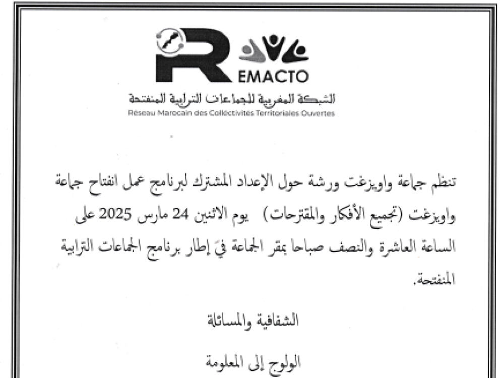 إعــــــلان عن تنظيم الورشة الثانية للإعداد المشترك لبرنامج عمل الانفتاح لجماعة واويزغت