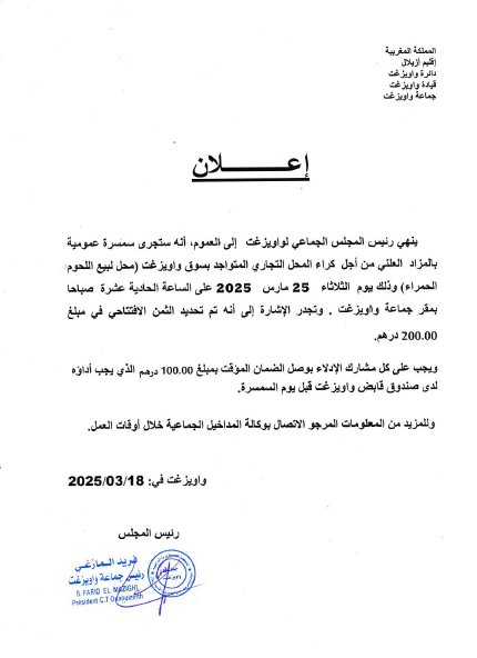 اعلان عن سمسرة عمومية بالمزاد العلني من اجل كراء محل تجاري المتواجد بسوق واويزغت ( محل لبيع اللحوم الحمراء ).pdf